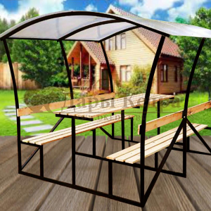 Беседка выполнена из стальной квадратной профильной трубы 40х40 мм. Лавки и стол обшиты кедровой доской. На крыше - поликарбонат. Беседка отличается простотой в установке, легкостью конструкции, долговечностью, прочностью и классическим дизайном, который впишется в любой интерьер приусадебного участка. Вокруг такой беседки можно организовать ландшафт из вьющихся растений, которые красиво создадут зеленые "стены" снаружи и уют внутри. Размер стола у разных моделей  варьируется в зависимости от ширины конструкции.