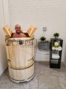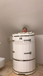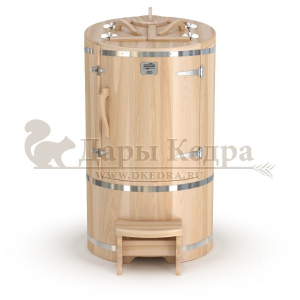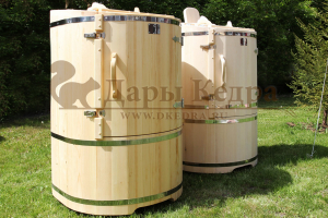 Круглая со скосом. Круглая фитобочка из кедра - это мини парная, которую можно использовать не только в спа-салонах, но и дома. Такая модель наиболее компактна и мобильна. Толщина стенок составляет 25 мм. Фитобочка оборудована откидными створками, дверцей и отверстием для головы. Верхний скос делает положение головы более комфортным и улучшает обзор. Во время парения человек сидит внутри кедровой бочки, а голова находится снаружи. Благодаря этому исключается возможность перегрева. Подлокотники из кедра, встроенные ручки на створках и двери делают эксплуатацию более удобной.