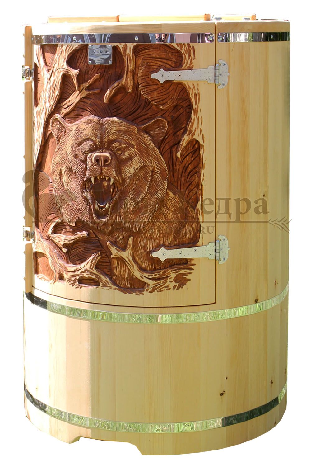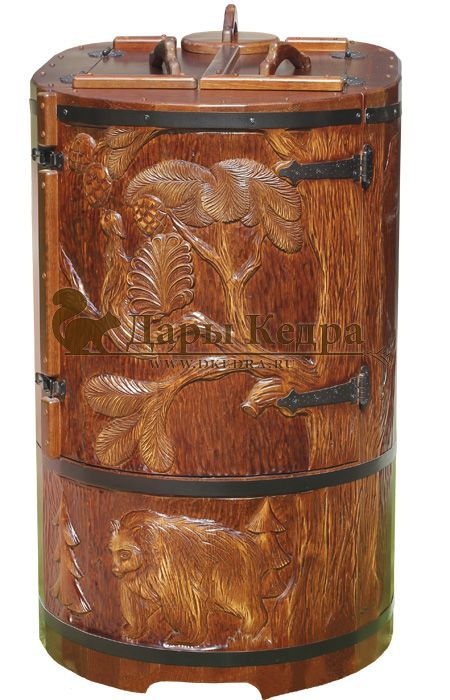 Кедровая бочка (фитобочка) «Фирменная» Это эксклюзивная фитобочка любой модели и комплектации с резьбой вашего логотипа или фирменного знака. Просто приготовьте эскиз рисунка, и наши мастера перенесут его на изделие. Авторский рисунок на фитобочек придаст оригинальность вашему дому или салону красоты, подчеркнёт вашу индивидуальность и непревзойденный вкус. Художественная резьба это ручная работа, выполняется разными мастерами и каждый рисунок неповторим. Вы можете выбрать предложенные варианты резьбы или подобрать изображение и мы предложим вам подходящий эскиз. На сайте представлены наши работы в качестве примера. Каждая резьба рассчитывается индивидуально и может быть нанесена на любую модель фитобочки. Парение в фитобочке благотворно влияет на организм в целом: повышается иммунитет, выводятся шлаки и токсины, улучшается работа органов тела и состояние кожи. Обязательно обращайте внимание на размер дверных проемов вашего помещения. Если они меньше 78 см, то закажите разборную модель!