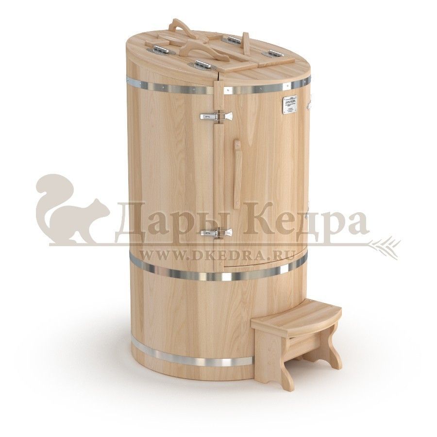 Кедровая бочка (фитобочка) овальная со скосом «Классическая» Овальная фитобочка из кедра - это мини парная, которую можно использовать не только в спа-салонах, но и дома. Овальная модель более просторна и удобна в использовании. Толщина стенок составляет 25 мм. Верхний скос делает положение головы более комфортным и улучшает обзор. Она оборудована откидными створками, дверцей и отверстием для головы. Во время парения человек сидит внутри кедровой бочки, а голова находится снаружи. Благодаря этому исключается возможность перегрева. Подлокотники из кедра, встроенные ручки на створках и двери делают эксплуатацию более удобной. Парение в фитобочке благотворно влияет на организм в целом: повышается иммунитет, выводятся шлаки и токсины, улучшается работа органов тела и состояние кожи.