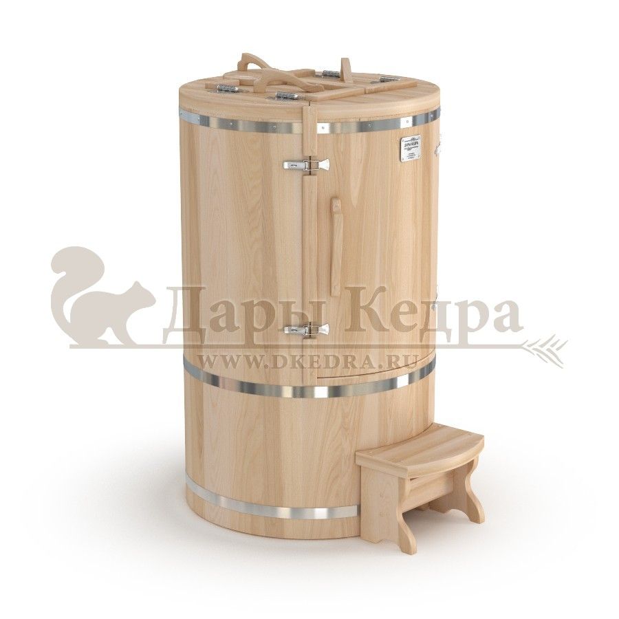 Готовый комплект «Универсальный»: кедровая бочка с парогенератором + био-защита изнутри и снаружи Готовый комплект - это полностью укомплектованный набор с фитобочкой для процедур парения. Овальная модель более просторна и удобна в использовании. Толщина стенок составляет 40-45 мм, что позволяет увеличить срок службы изделия. Верхний скос делает положение головы более комфортным и улучшает обзор. Фитобочка оборудована откидными створками, дверцей и отверстием для головы. Во время парения человек сидит внутри кедровой бочки, а голова находится снаружи. Благодаря этому исключается возможность перегрева. Подлокотники из кедра, встроенные ручки на створках и двери делают эксплуатацию более удобной. Парение в фитобочке благотворно влияет на организм в целом: повышается иммунитет, выводятся шлаки и токсины, улучшается работа органов тела и состояние кожи.