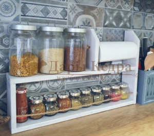 На кухне: данный вариант полки подойдет для размещения больших и маленьких банок для сыпучих, а также для салфетов в рулоне